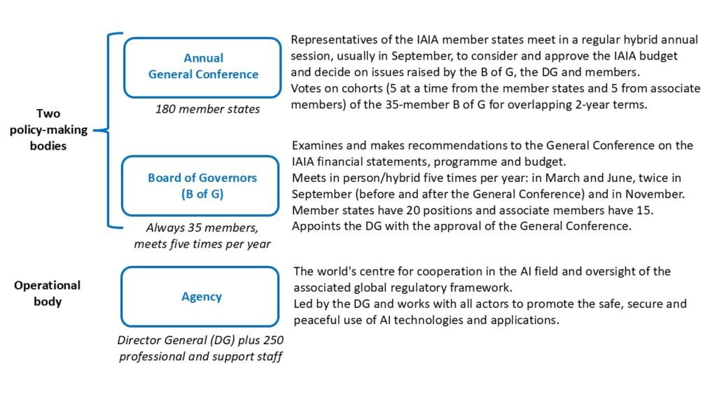 The IAEA model of two policy-making bodies would be retained; the IAIA General Conference would meet in a hybrid format and the 35-member governing board would be reconstituted to include 20 representatives of member states as well as a smaller number (15) of associate member representatives from big tech.